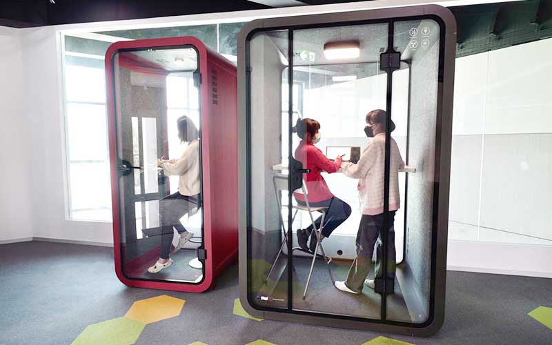 Nowdays, more and more people enjoy having more privacy in their workplace, but how we can make it simple, flexible and money-saving? Don’t worry, over the years, we have developed many ways to achieve this goal, sound insulated room, acoustic operable partition, and now we have silent pods, our silent pods transform open-plan office to become more flexible, enabling people to have privacy whenever they want, with the multiple functions of this pods, our staff can be more efficient and happier.